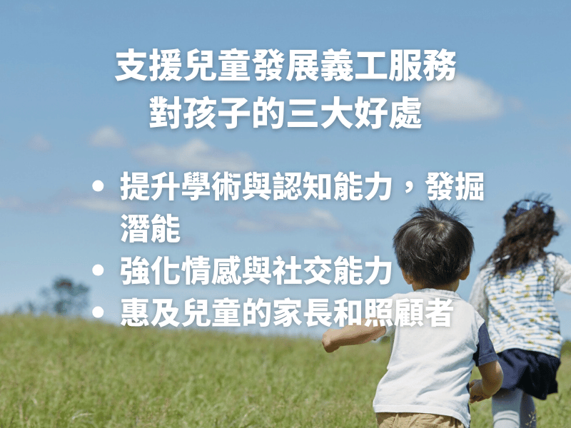 答:義工服務有助於提升兒童的學術成績、發掘潛能、增強解難能力、情感韌性與自信心、改善社交溝通技能,並促進其長遠發展。